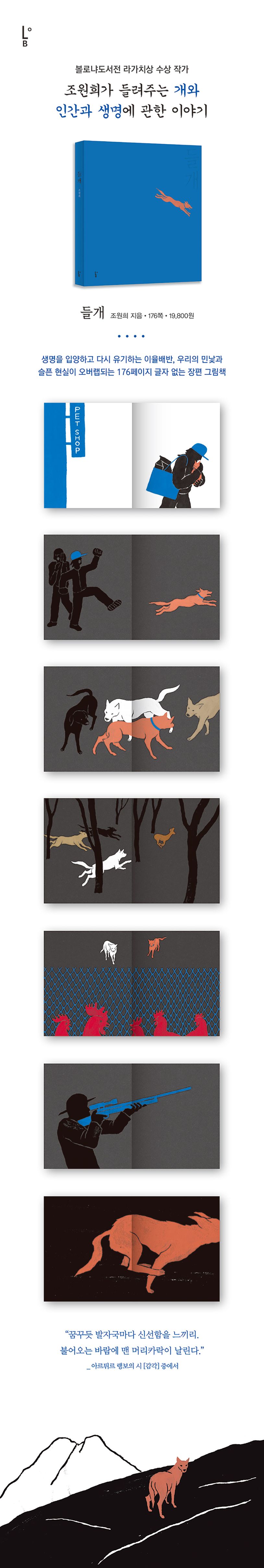 볼로냐 라가치상 수상 작가 조원희가 들려주는 개와 인간과 생명에 관한 이야기. 생명을 대하는 우리의 민낯과 슬픈 현실이 오버랩되는 176페이지 글자 없는 장편 그림책.