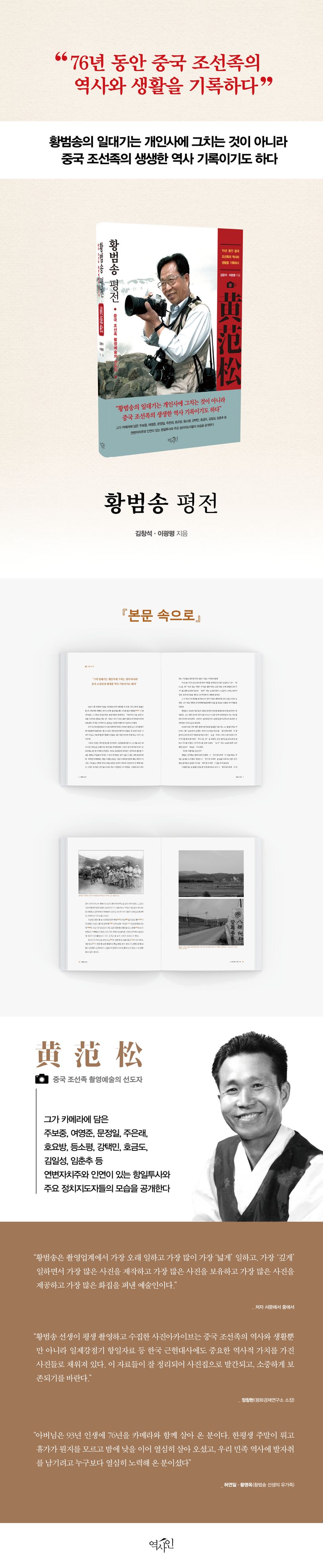 황범송은 촬영업계에서 가장 오래 일하고 가장 많이 가장 ‘넓게’ 일하고. 가장 ‘깊게’ 일하면서 가장 많은 사진을 제작하고 가장 많은 사진을 보유하고 가장 많은 사진을 제공하고 가장 많은 화집을 펴낸 사진가이다. 중국, 한국과 조선 등 중국 조선족의 역사와 생활, 인물들에 관심이 있는 분들에게 이 책을 추천한다.