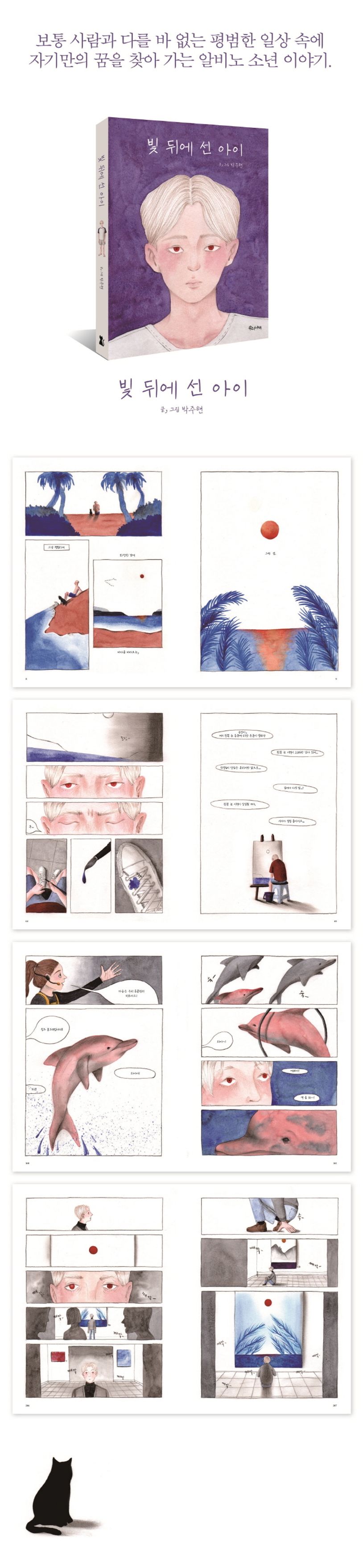 《빛 뒤에 선 아이》는 이렇게 편견과 차별이라는 불편 속에 살아가는 전신성 백색증 소년의 이야기를 그린 책이다. 백색증을 가진 사람의 불편함을 함부로 정의하거나 판단하지 않은 채 평범한 일상을 그대로 담아 그들의 삶도 보통 사람과 다르지 않음을 드러낸다. 특이한 외모와는 별개로 자아와 미래를 찾기 위해 노력하는 주인공은 우리 주변에서 흔히 볼 수 있는 10대 소년과 별반 다를 바 없는 모습이다. 작가는 신체적 특징에 기대기보다는 자기만의 꿈을 좇는 소년을 그리며 알비노라는 희귀성을 악용해 그들의 의지와는 상관없이 대중 소비용으로 쓰고자 하는 현실을 비판한다. 또한, 백색증에 대한 인식 개선이 이루어져 불편한 시선이나 언행으로부터 받는 스트레스를 덜고 나아가 아프리카 알비노 아이들에 대한 관심도를 높여 보호책이 마련되기를 바라는 기획 의도가 돋보이는 작품이다.
