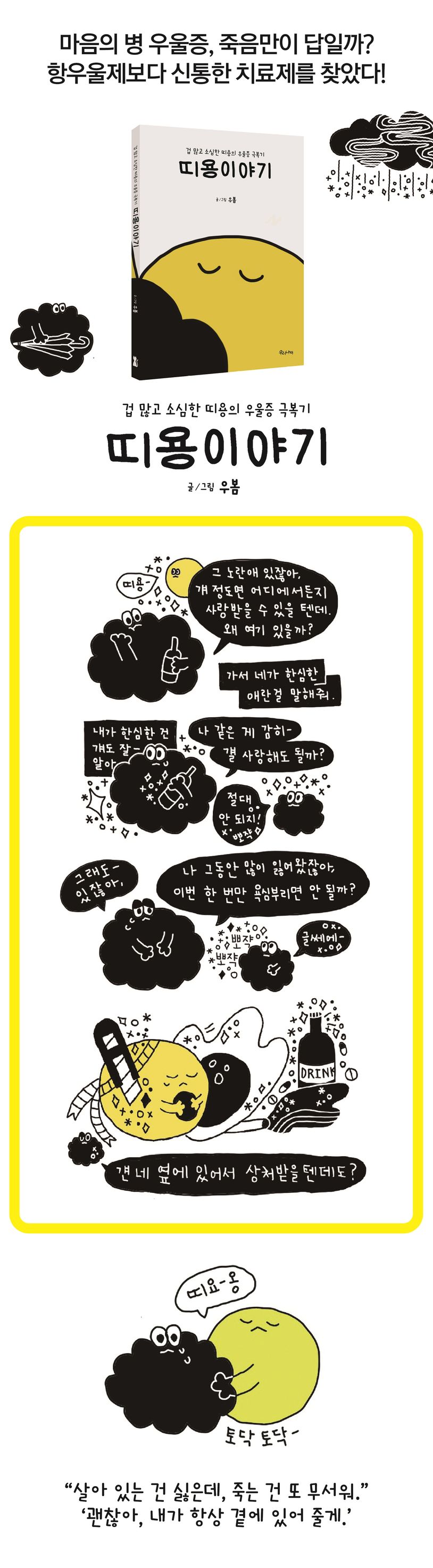마음의 병을 앓고 있는 한 존재의 일상을 엮은 이야기이다. 우울증으로 인해 몸도 마음도 피폐해지고 정신마저 뒤엉켜 하루하루가 고난의 연속이다. 수면 장애, 식이 장애, 무기력증을 달고 사는 ‘띠용’이 주로 하는 생각은,