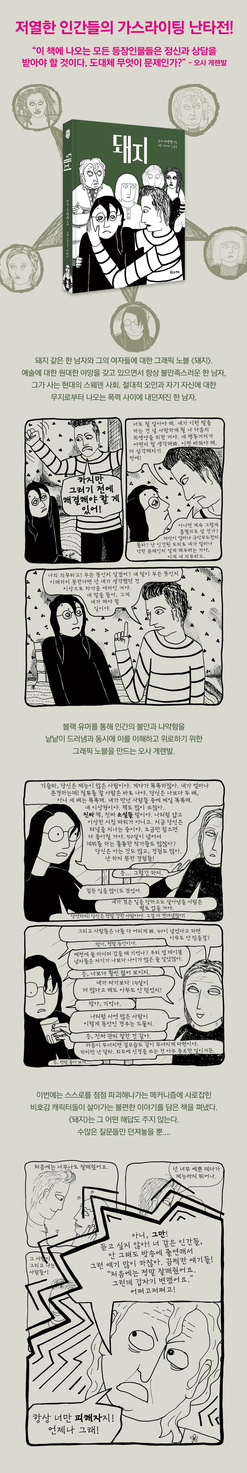 어둡고 강렬한 이미지, 생생한 대화, 날카로운 블랙 유머를 곁들인 사려 깊은 이야기로 우리 삶의 가장 어두운 부분을 주저 없이 지적하는 스웨덴 작가 오사 게렌발이 또 하나의 심리 탐구적 그래픽 노블을 펴냈다. 스스로를 점점 파괴해 나가는 메커니즘에 사로잡힌 비호감 캐릭터들의 불편한 인생 이야기, 『돼지』이다.