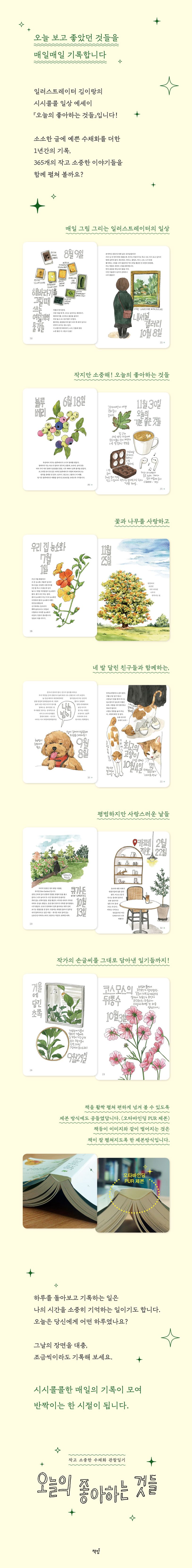 이 책은 사소한 것들을 소중히 바라볼 줄 아는 김이랑 작가의 1년간의 기록이다. 소소한 글에 예쁜 수채화를 더해 지난 1년의 나날을 365개의 일기로 기록했다. 작가가 꾸준히 실천한 ‘1일 1그림’ 컬렉션과도 같은 책. 산책 중 발견한 작은 꽃, 그날 본 책과 영화, 잠깐 마주친 길고양이 등 별거 없는 하루의 이야기마저도 사랑스러운 그녀의 기록은 누군가에겐 신선한 자극이 되기도, 누군가에겐 기록에 대한 의지를 심어 주기도 할 것이다.