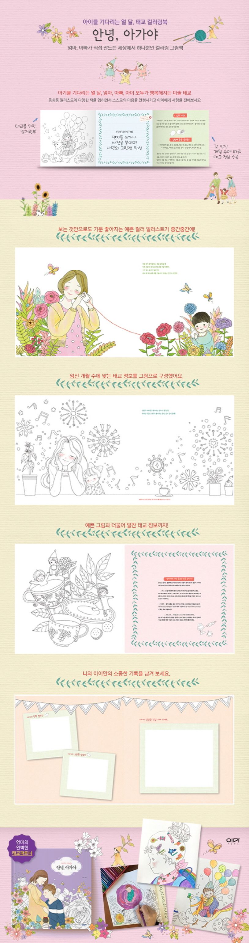 [안녕, 아가야]는 컬러링으로 얻을 수 있는 태교 효과 외에도 엄마의 완벽한 태교 파트너가 될 수 있도록 꾸며진 책이다. 임신 개월 수에 맞춰 10개로 나눠진 챕터 안에 임신 각 개월의 특징과 신체적, 정서적 변화에 맞추어 그린 동화적인 일러스트, 필요한 태교 정보, 초음파 사진과 아이에게 보내는 편지 등을 직접 꾸밀 수 있는 페이지 등이 알차게 구성되어 있다. 완성하고 나면 단순한 컬러링북이 아니라 엄마가 아이에게 전할 수 있는 사랑 가득한 한 권의 그림책이자 기록이 될 수 있을 것이다.