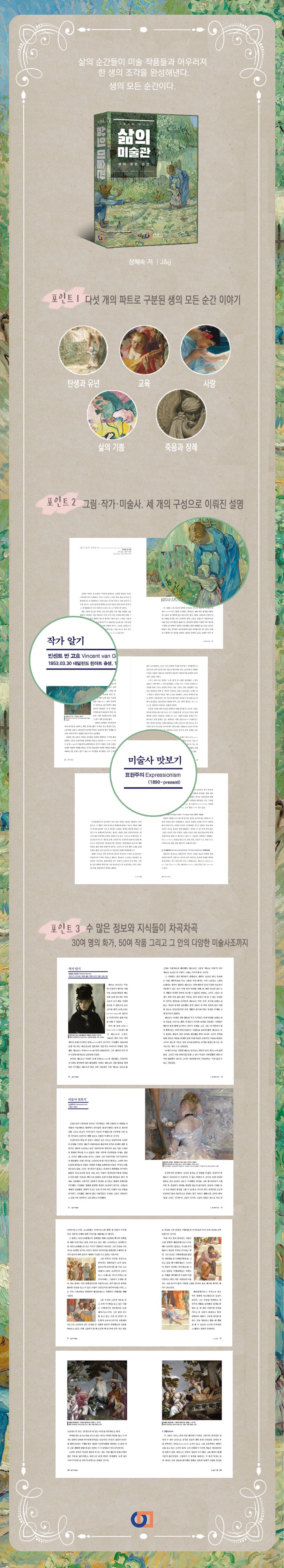 삶이란 무엇일까? 예술은, 미술이란 무엇일까? 언뜻 하나로 모아지지 않는 이야기들을 한 권의 책에 담기 위해 작가는 자신의 경험을 보따리 풀 듯 하나씩 꺼내놓았다. 무수한 그림들과 예술 작품이 걸어온 길을 걸으며 30여 명의 화가가 그린 50여 작품을 선정해 세상에 하나뿐인 미술관을 지어냈다. 관람객들에게 이야기하듯, 아이들에게 가르치듯 저자가 풀어내는 삶의 슬라이드들이 엄선된 미술 작품들과 어우러져 한 생의 조각을 완성해낸다. 생의 모든 순간이다.