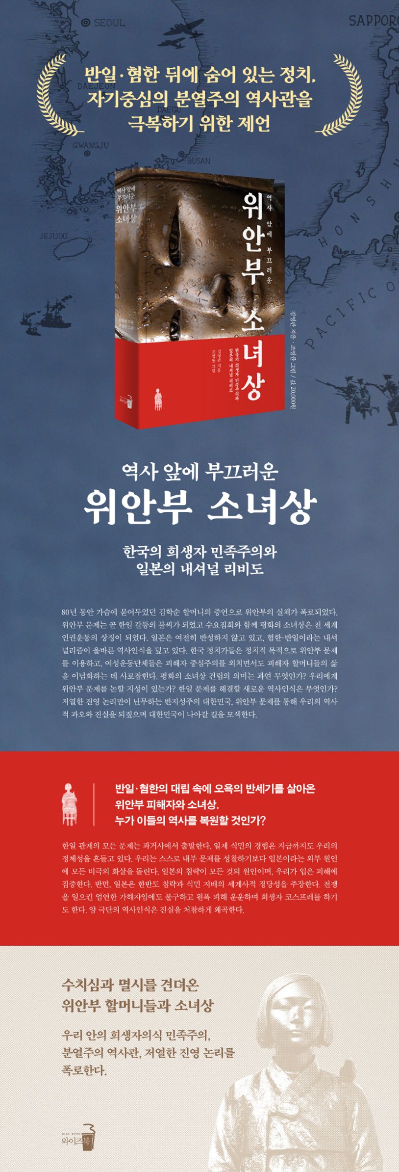이 책은 이렇듯 위안부 문제와 소녀상을 둘러싸고 벌어지는 논란을 통해 우리의 역사인식을 들여다보고, 우리 안에 내재된 희생자의식 민족주의, 피해자 중심주의, 분열주의 역사관, 저열한 진영 논리를 되짚어본다.