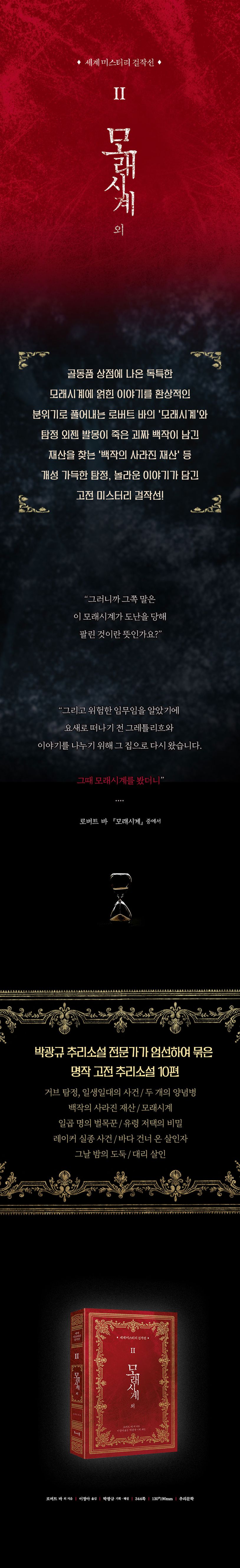 《세계미스터리걸작선2-모래시계외》에는외국인탐정,통신교육을이수한탐정,무명의탐정,오컬트탐정등각양각색의탐정들과때로는유쾌하고때로는기묘하고섬뜩한10편의고전추리소설을담았다.사건의설정과상황의묘사,해결방법도각양각색인클래식미스터리작품들을현대적인번역,깔끔한편집으로새롭게즐겨보자!