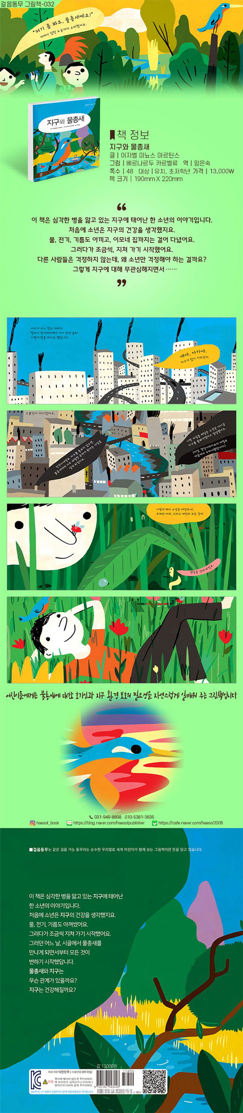 하지만 아무리 강조하고 캠페인을 벌여도 일상생활에서는 환경 보호를 위한 실천이 제대로 이루어지지 않고 있습니다. 왜일까요? 바로 나만 괜찮으면 다 괜찮다는 무관심과 게으름에서 비롯된 것이 아닐까요. 〈지구와 물총새〉 그림책은 바로 이러한 환경 보호 메시지를 개인의 관점에서 어떻게 하면 관심을 가지고 실천할 수 있는지 작은 깨달음을 줍니다.