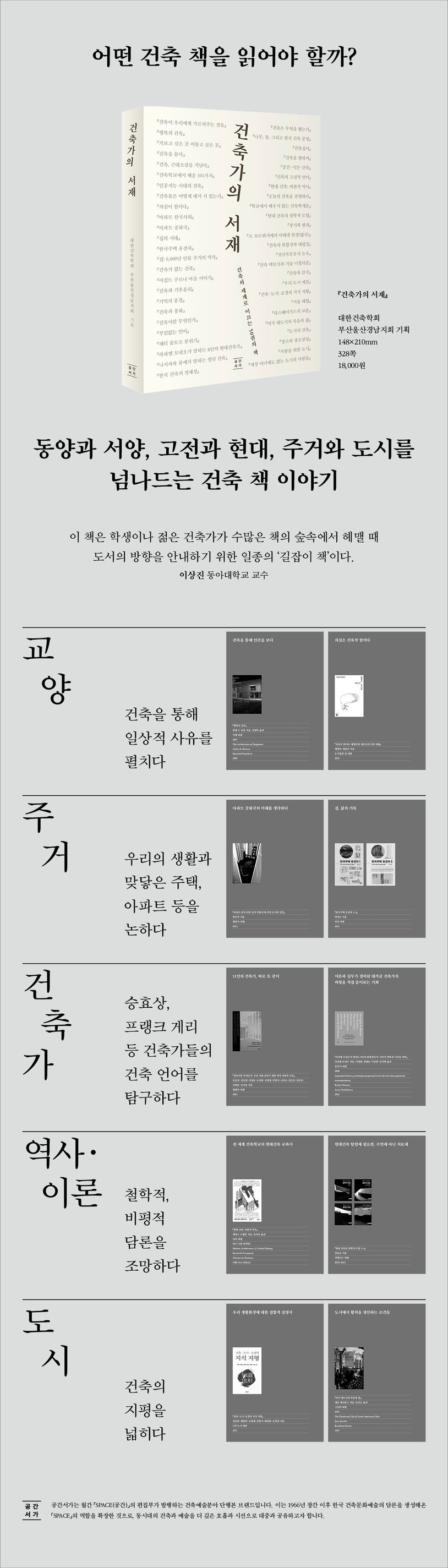 『건축가의 서재』는 동양과 서양, 고전과 현대, 주거와 도시를 아우르는 건축 필독서 50권을 소개하는 책이다. 건축학자, 건축가 등 전문가가 엄선한 책들을 교양, 주거, 건축가, 역사, 이론, 도시 총 여섯 개의 장으로 구분해 정리했다. ‘교양’에서는 ‘왜 이 건축물을 아름답다고 여길까?’와 같이 건축을 통해 일상적 사유를 펼칠 수 있는 책을, ‘주거’에서는 우리의 생활과 맞닿은 주택, 아파트 등에 대한 전문가들의 관점을 소개한다. ‘건축가’에서는 익히 들어본 정기용, 승효상, 미스 반 데어 로에, 프랭크 게리 등의 건축 언어를 탐구하는 한편, 후반부인 ‘역사’와 ‘이론’에서는 건축과 연관한 철학적, 비평적 담론을 조망한다. 마지막 ‘도시’에서는 건축의 집합이라고 할 수 있는 도시를 살펴봄으로써 건축 지식의 지평을 넓힌다. 후반부로 갈수록 깊고 넓은 건축의 세계로 안내하는 이 책은 건축학도, 건축가뿐 아니라 일반인까지 두루 읽을 수 있는 충실한 안내서가 될 것이다.
