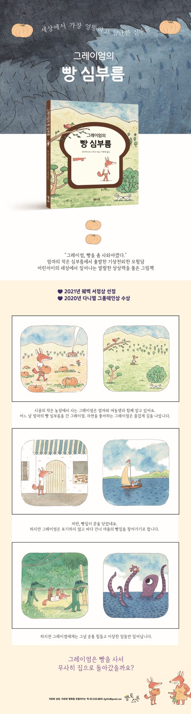 시골의 작은 농장에서 호박을 키우며 사는 그레이엄은 착하고 부지런하지만 조금 소심합니다. 어느 날 엄마는 빵이 떨어졌다며 빵을 사오라는 심부름을 보냅니다. 자연에서 노는 걸 좋아하는 그레이엄은 얼른 길을 나서지만 그레이엄이 딱 하나 알고 있는 빵집은 문이 닫혀 있습니다. 엄마의 빵 심부름을 꼭 해내고 싶었던 그레이엄은 다른 빵집을 찾아나섭니다. 빵집을 찾아 바다를 건너가다 배가 난파한 후 그레이엄 앞에 상상도 못했던 사건들이 펼쳐집니다. 반전에 반전을 거듭하는 그레이엄의 빵 심부름은 어떻게 되었을까요? 그레이엄은 무사히 빵을 사서 집으로 돌아갔을까요?