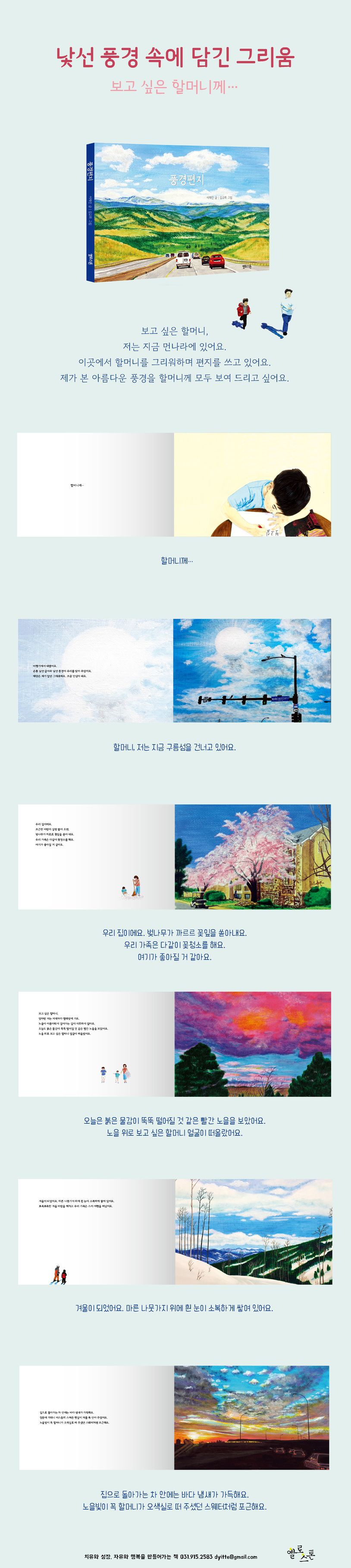 《풍경편지》는 낯선 타향살이를 하면서 한국과 가족에 대한 그리움을 담고 있는 그림책이다. 부모와 함께 2년간 미국에 가서 살게 된 아이가 느끼는 외로움과 가족애를 일상의 풍경과 낯선 여행지에서의 경외감에 담아 글과 그림으로 표현하고 있다. 특히 어린 동생의 세상에 대한 두려움을 다독여주는 형의 든든한 모습은 실제 형이 보이지는 않지만 동생의 묘사를 통해 잘 드러난다.