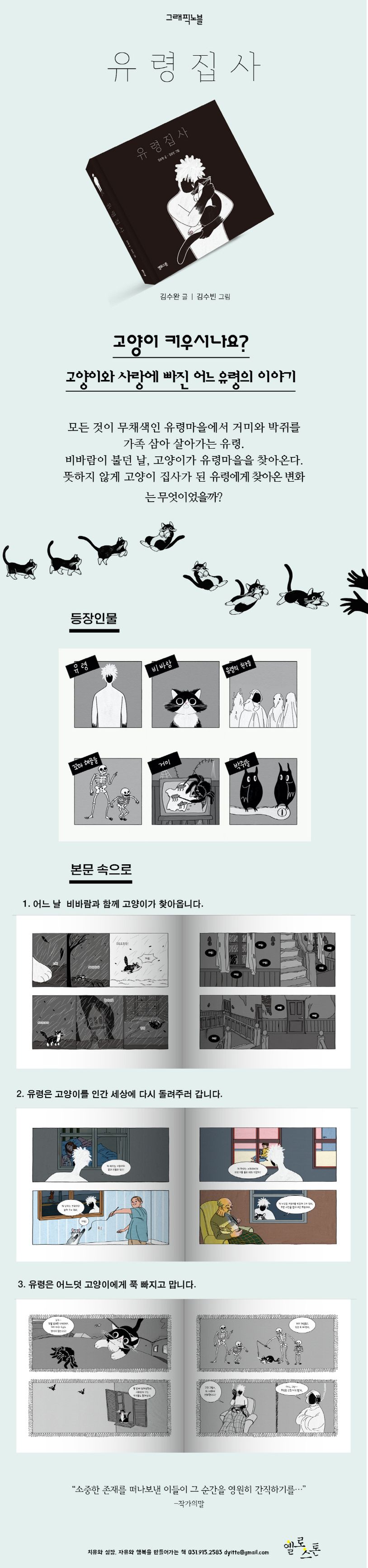 모든 것이 무채색인 세상에서 우연히 찾아온 고양이를 키우게 된 유령의 이야기를 담은 그래픽노블이다. 그림책 《수염왕 오스카》 《행복한 세세 씨》로 그림책 독자들에게 익숙한 김수완, 김수빈 자매가 두 책에 이어 고양이를 모델로 그림책보다 조금 긴 장편으로 찾아왔다.