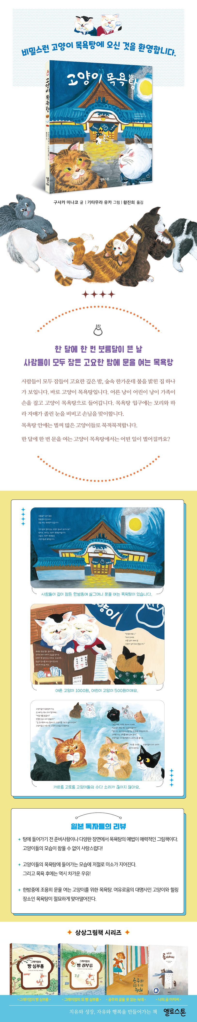 사람들이 모두 잠들어 고요한 깊은 밤, 숲속 한가운데 불을 밝힌 집 하나가 보입니다. 바로 고양이 목욕탕입니다. 어른 냥이 어린이 냥이 가족이 손을 잡고 고양이 목욕탕으로 들어갑니다. 목욕탕 입구에는 모리와 하라 자매가 졸린 눈을 비비고 손님을 맞이합니다. 자매의 나이는 아무도 모르지만 반말을 하는 고양이를 혼을 내는 것을 보면 할머니 고양이 같습니다.