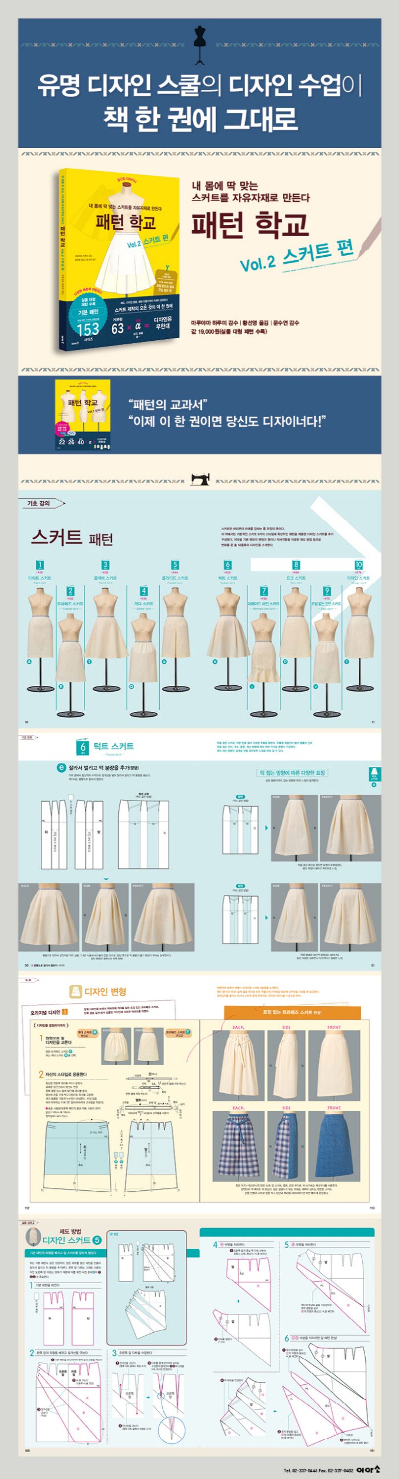 《패턴 학교 Vol. 2 스커트 편》은 피트감이 핵심인 허리부터 엉덩이를 중심으로 디자인을 구성하는 치수의 의미와, 선의 형태 같은 섬세한 부분까지 마치 현장 수업을 듣는 듯 매우 자세히 소개하고 있다. 원형이 되는 ‘기본 패턴’은 다양한 체형에 대응할 수 있도록 153개 사이즈로 전개할 수 있는 실물 대형 패턴을 수록했다. 또 사이즈에 관계없이 허리와 엉덩이 치수를 토대로 만드는 법을 소개해 체형이나 나이 등을 초월해 누구나 활용할 수 있다.