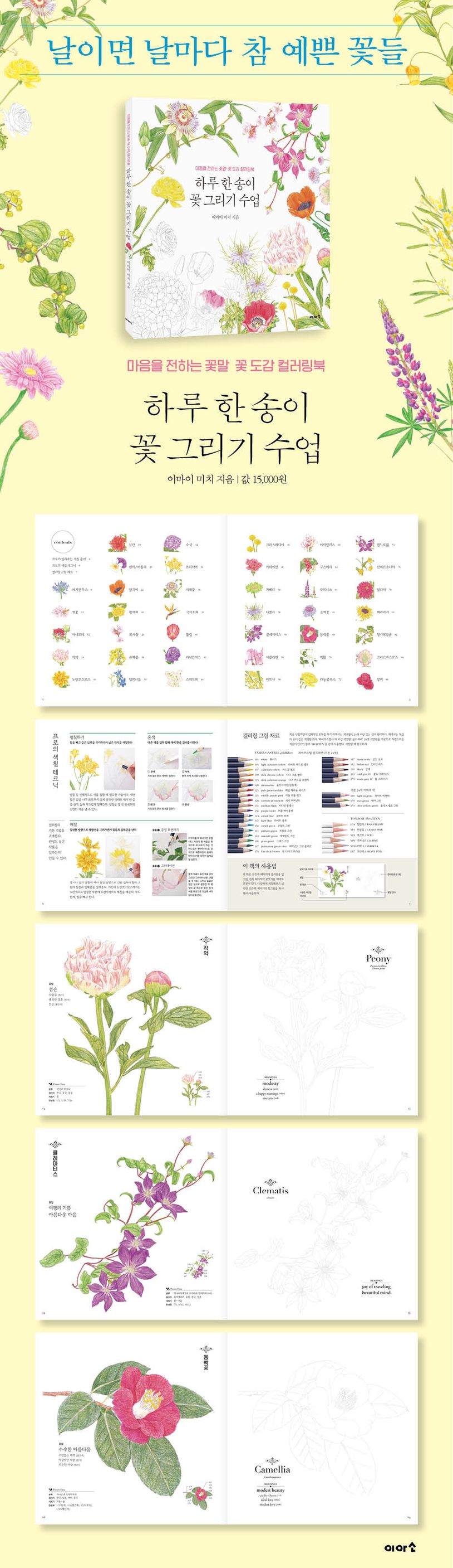 이 책은 꽃집에서 가장 인기 있는 꽃, 그림 그리고 싶다는 요구가 높은 꽃으로 선정해 기획했다. 거베라, 수국, 작약, 복사꽃, 프리지어…, 사랑스럽고 친숙한 꽃부터 덴드로븀, 라눙쿨루스, 솔체꽃 등 눈에 익으면서도 이름을 알지 못했던 이국적인 꽃까지 총 40점이 제각기 매력을 뽐낸다.