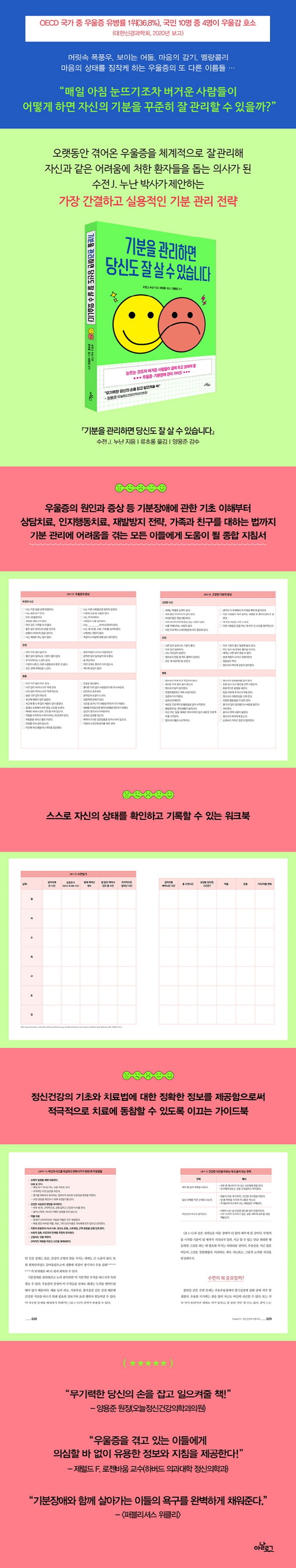 수전 J. 누난 박사는 오랜 시간 우울증을 겪어온 당사자이자 의사로서 환자들을 치료해온 경험을 바탕으로 현실적인 관점에서 이 책을 구성했다. 누군가에게는 너무나도 당연한 일들, 예를 들면 제대로 자고, 제대로 먹고, 몸을 움직이는 일 같은 것도 기분장애를 겪고 있는 사람들에게는 결코 쉬운 일이 아니기에 이 책에서는 워크북 형식을 빌려 자신의 힘으로 그 일들을 해낼 수 있도록 돕는다. 평범하고 쉬워 보이는 일들이지만, 이 같은 일상 속 생활습관 관리는 치료의 시작이 될 수 있다.