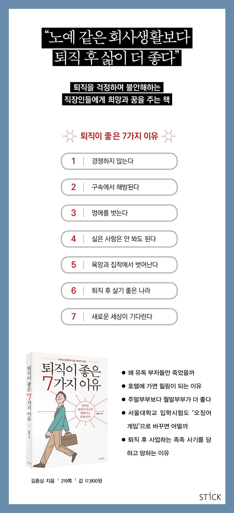 퇴직자들을 대상으로 강의했던 자료들을 모아 정리했다. 단순한 주장이 아니라 오랜 기간 직장인을 대상으로 강의하면서 수많은 퇴직자가 공감한 내용이다. 현대자동차, 한국전력, 두산에너빌리티, 삼성중공업, 부산교통공사, SK, LG화학 등 많은 기업의 요청으로 퇴직자 교육용 책을 집필하게 되었으며, 퇴직 후 삶이 왜 더 좋은지 독자들에게 전해준다.