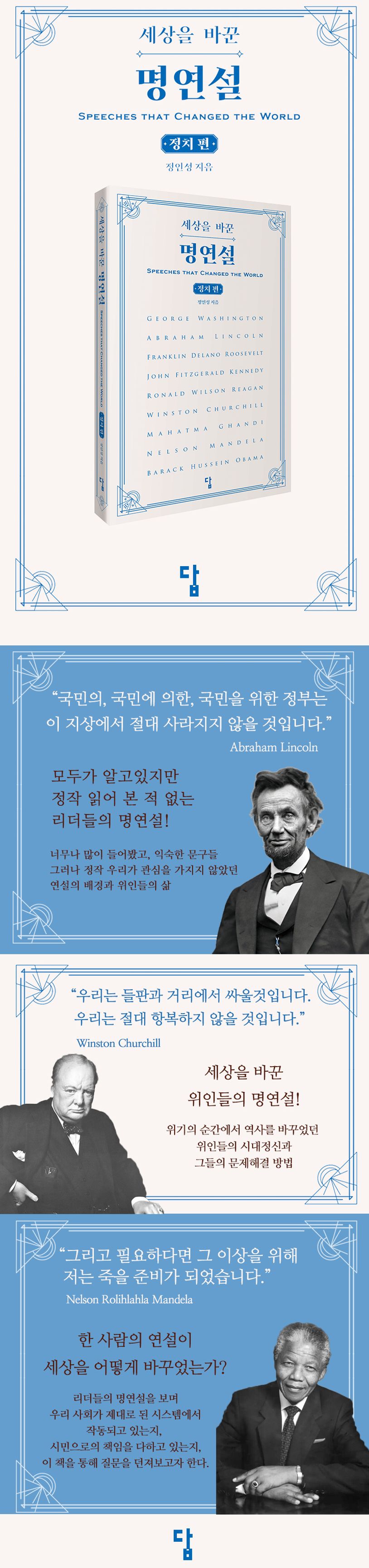이 책은 조지 워싱턴, 에이브러햄 링컨, 프랭클린 D. 루즈벨트, 윈스턴 처칠, 넬슨 만델라, 존 F. 케네디, 로널드 레이건, 버락 오바마 등의 대통령들이 남긴 명연설을 수록하고 있다. 이들이 남긴 연설을 보며 우리 사회가 제대로 된 시스템에서 작동되고 있는지도 돌아봐야 할 것이다. 시민으로의 책임을 다하는 것은 단순히 투표장에 가서 한 표를 행사하는 것에 그치는 것이 아니라, 투표 이후에도 당신이 그리고 우리가 선택한 정치인이 국민에게 한 약속과 공약을 성실히 잘 이행하고 있는지, 꾸준히 관심을 가지고 지켜보는 것, 그리고 기억하는 것까지 국민 된 자의 의무이다. 이 책을 통해, 우리 사회가 당면한 문제를 어떻게 해결할 수 있는지 질문을 던져보고자 한다.