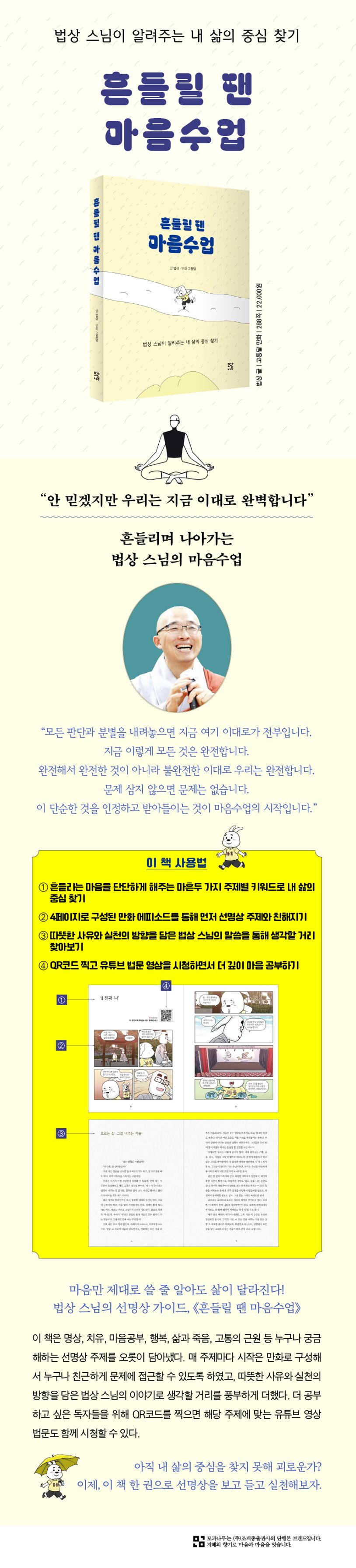 매 주제의 시작은 만화로 구성해서 누구나 친근하게 문제에 접근할 수 있도록 하였고, 이어서 따뜻한 사유와 실천의 방향을 담은 법상 스님의 이야기로 생각할 거리를 풍부하게 더했다. 여기서 끝나지 않고 더 공부하고 싶은 독자들을 위해 QR코드를 찍으면 해당 주제에 맞는 유튜브 영상 법문도 함께 시청할 수 있다.