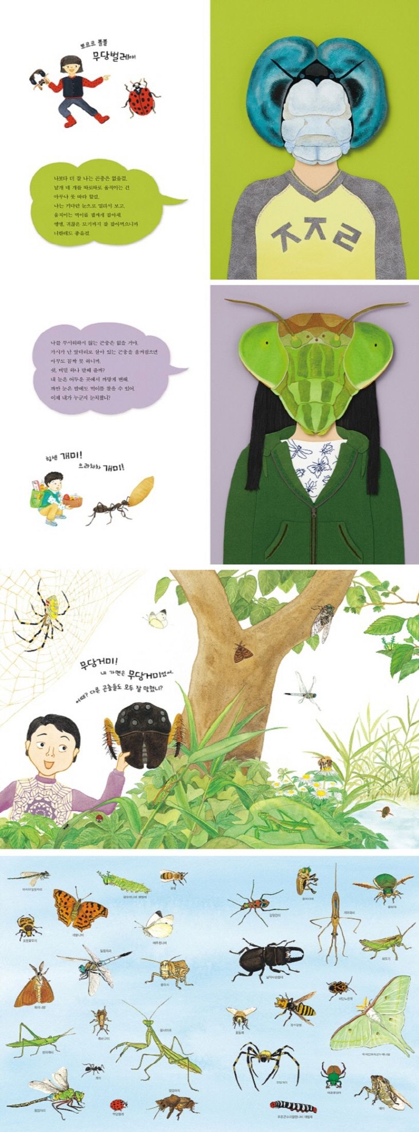 12명의 아이들이 각기 다른 곤충 가면을 쓰고, 그 곤충이 되어 퀴즈를 냅니다. 곤충의 생김새며 살아가는 모습을 설명하면, 어떤 곤충인지 알아맞히는 거예요. 힌트는 아이들이 입은 옷의 무늬나 색깔! 자, 어떤 곤충일까요? 곤충 가면의 얼굴을 자세히 살펴보고, 어떤 곤충인지 맞혀 보세요.