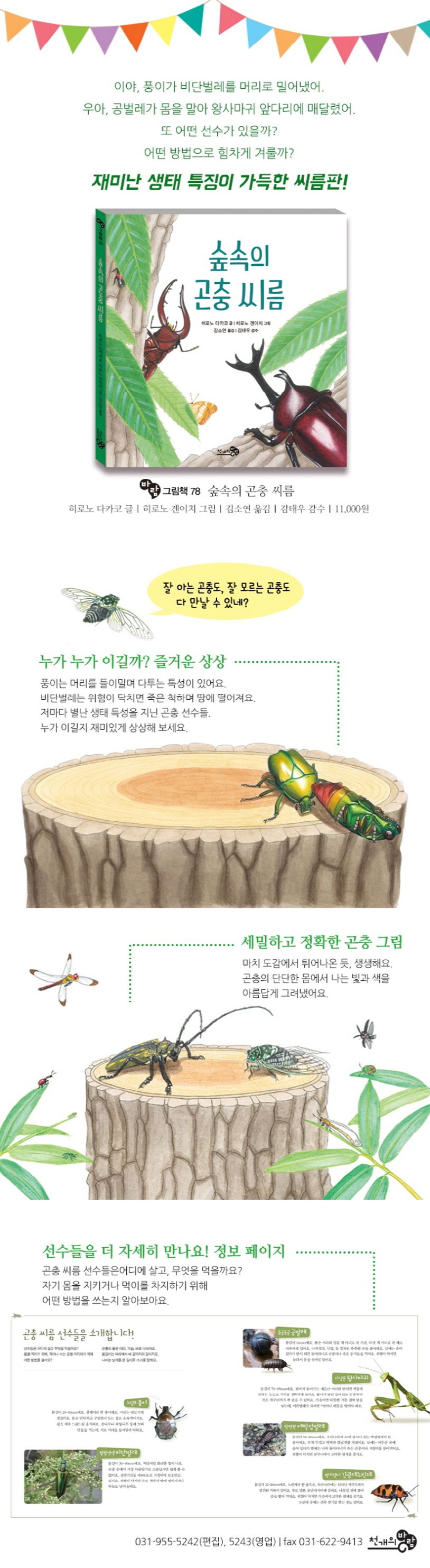숲속에서 곤충 씨름이 열려요. 힘내라, 힘! 벌써 힘찬 응원이 퍼지고 있어요. 곤충 씨름 선수들이 짝지어 그루터기에 올라요. 생김새도, 몸집도 다르니까 저마다의 겨루기 방법도 달라요. 비단벌레는 그냥 죽은 척해요. 공벌레는 또르르 몸을 말아요. 사슴벌레와 장수풍뎅이는 큰턱과 큰뿔로 엎치락뒤치락 겨뤄요. 또 어떤 선수들이 나올까요? 또 어떤 방법으로 힘차게 겨룰까요?