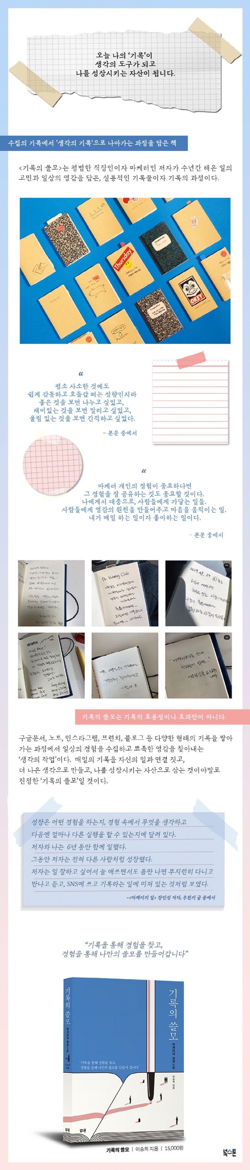 이 책에서 말하는 기록의 쓸모는 기록의 효용성이나 효과만이 아니다. 저자는 구글문서, 노트, 인스타그램, 브런치, 블로그 등 다양한 형태의 기록을 쌓아가는 과정에서 일상의 경험을 수집하고 뾰족한 영감을 찾아내는 ‘생각의 작업’에 발을 들이게 되었다고 말한다. 매일의 기록을 자신의 일과 연결 짓고, 더 나은 생각으로 만들고, 나를 성장시키는 자산으로 삼는 것이야말로 진정한 ‘기록의 쓸모’일 것이다.