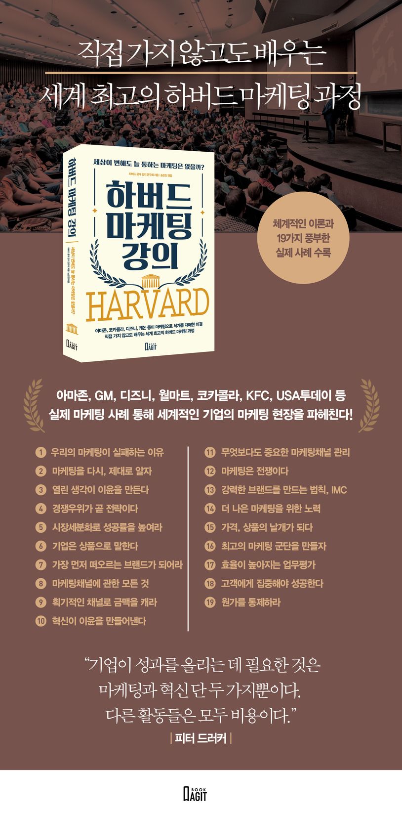 〈하버드 마케팅 강의〉에서는 아마존과 같이 성공한 기업들의 마케팅을 파헤쳐 그들이 펼쳤던 마케팅을 생동감있게 전달한다. 마치 세계 최고의 기업 마케팅팀에서 일하는 것처럼 상세하고 생생하게 다양한 마케팅을 간접체험하게 될 것이다.