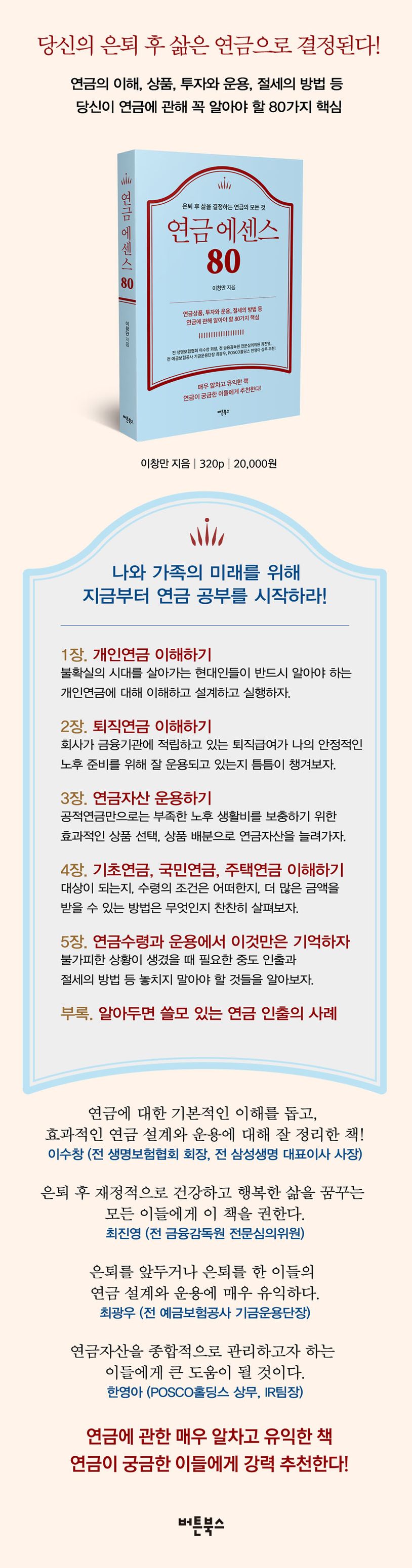 연금에 관한 가장 핵심적인 주제와 내용 80가지를 꼭 필요한 사례와 함께 소개하고 있는《연금 에센스 80》과 함께 자신의 연금자산을 계획하고 실행하고 꾸준히 관리한다면, 나와 가족을 위한 보다 편안하고 행복한 노후를 맞이하게 될 것이다.
