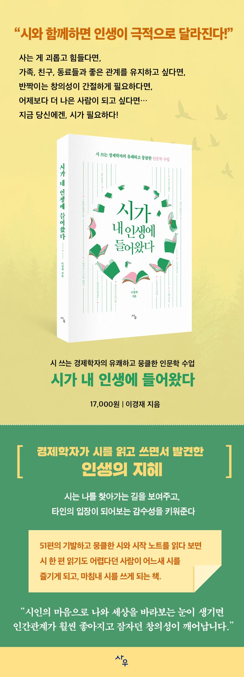 대학에서 경제학을 가르치는 저자는 시에 문외한이었다. 딱딱하고 어려운 전공과목을 더 쉽고 재미있게 강의하고 싶은 마음에 시를 쓰기 시작했고, 기발하면서도 통찰력 넘치는 시를 동원해 강의를 하자 학생들의 반응이 뜨거웠다. 긍정적인 반응에 힘입어 부단히 시를 읽고 쓴 결과 마침내 등단을 하고 시인이 되었다.