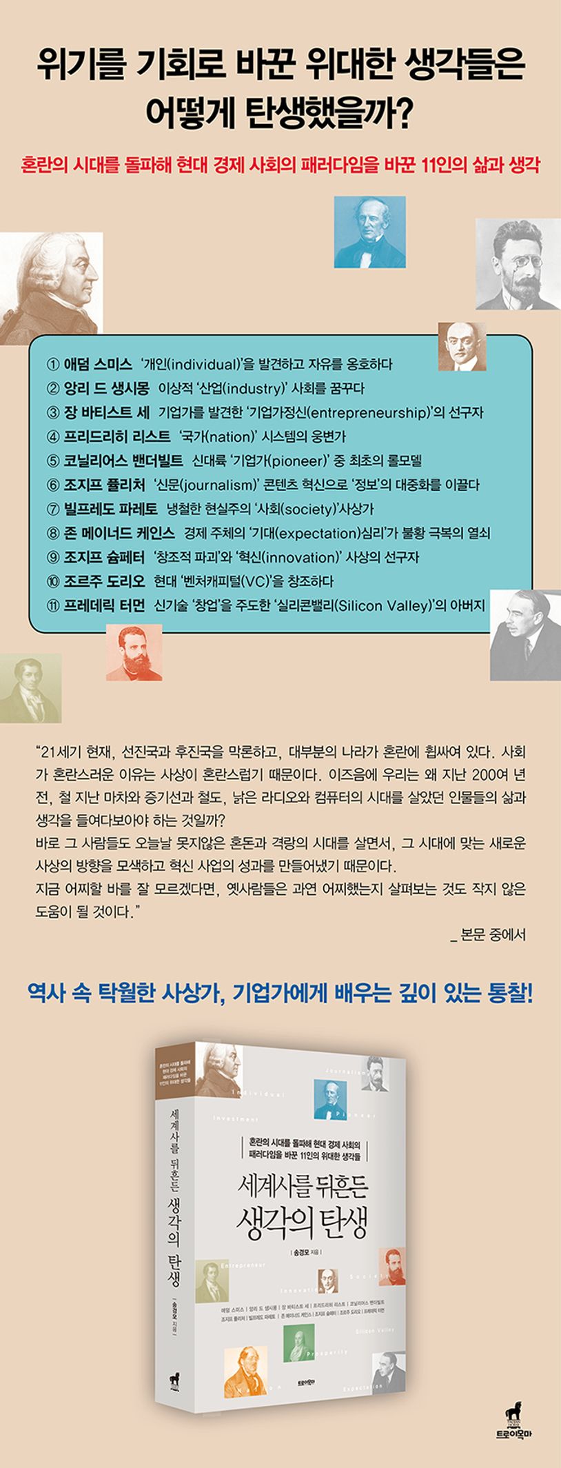 18세기 초에 스코틀랜드에서 태어나 중세 기독교 문화를 극복하고 ‘개인(individual)’과 ‘자유(freedom)’의 가치를 설파한 애덤 스미스가 국가의 역할을 무시하고 자유시장 경제만을 옹호했다는 오해, ‘산업(industry)’의 가치와 ‘기업가(entrepreneur)’를 발견함으로써 역사를 진보시킨 프랑스 출신의 앙리 드 생시몽과 장 바티스트 세의 삶과 숨겨진 업적, 독일에서 위대한 사상가로 추앙받는, ‘국가(nation)’ 시스템의 역할을 강조한 프리드리히 리스트의 ‘보호무역’ 옹호론에 관한 진실, 냉혹하고 무미건조한 삶을 살았지만 경영의 원칙을 고수한 미국 ‘최초의 재벌 기업가’ 코닐리어스 밴더빌트가 현대에까지 끼친 영향력, 정치적 목적을 지양하고 대중에게 재미있고 의미 있는 정보를 제공함으로써 현대 ‘저널리즘(journalism)’의 선구자가 된 조지프 퓰리처의 드라마틱한 삶, 초기에 스미스식 이상주의(idealism) 관점에서 세상을 바라봤던 빌프레도 파레토가 이후 마키아벨리식 ‘현실주의(realism) 사상’으로 생각을 바꾼 이유, 자유시장 옹호자의 가장 강력한 대항마로 전 세계 ‘반(反)시장주의’ 경제학자들의 각광을 받은 존 메이너드 케인스 경제학의 진짜 실체, 현대 경영자들에게 가장 큰 영향력을 미치고 있는 창조적 파괴의 ‘혁신(innovation)’ 사상을 설파한 조지프 슘페터의 혜안, 그리고 대부업이 아닌 공모 자금으로 창업 기업에 투자하는 ‘벤처캐피털(venture capital)’의 창시자 조지프 도리오와 과학기술로 무장한 혁신기업의 창업을 적극적으로 도와 ‘실리콘밸리(Silicon Valley)’라는 생태계를 만든 프레데릭 터먼의 생애가 이 한 권의 책에 담겨 있다.