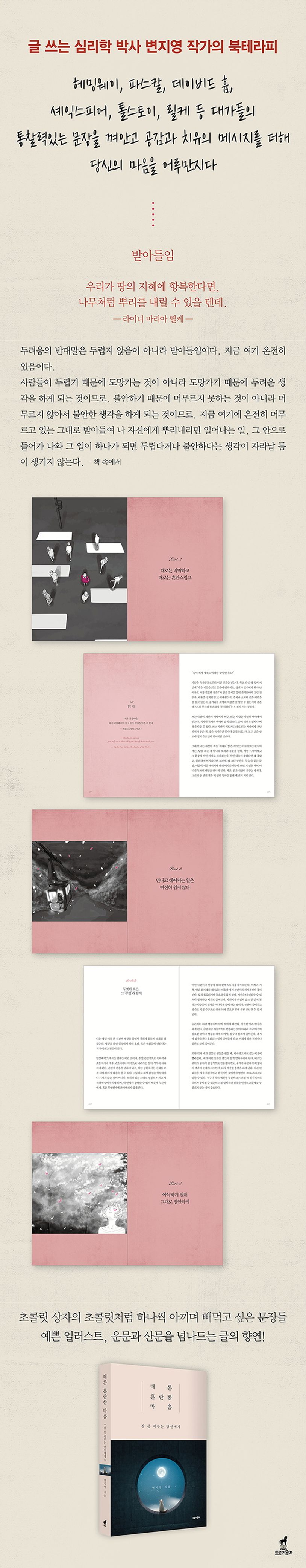 임상·상담심리학 박사이자, 아들러 심리학의 정수를 담은 베스트셀러 《항상 나를 가로막는 너에게》의 작가 변지영이 위대한 소설가, 철학자, 시인, 사상가들의 문장과 함께 써내려간 힐링 에세이를 선보인다.