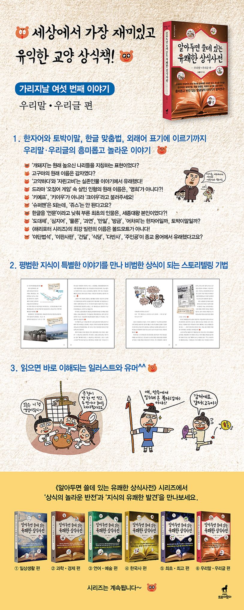 시리즈 제1권 ‘일상생활 편’, 제2권 ‘과학ㆍ경제 편’, 제3권 ‘언어ㆍ예술 편’, 제4권 ‘한국사 편’, 제5권 ‘최초ㆍ최고 편’이 독자들에게 열렬한 반응을 얻으면서, 이번에는 우리 민족의 역사 속에서 변화하고 발전해온 ‘우리말ㆍ우리글 편’을 출간했다. 이 책은, 저자가 30년 이상 다양한 분야의 책과 방송, 논문, 신문 등 다양한 매체를 두루 읽고 공부하며 쌓아온 내공의 집합체로, 어렵고 단편적인 지식을 쉽고 재미있게, 입체적으로 전달하고자 오랜 시간 노력한 결과물이다. 그중 우리 민족의 정신과 지식의 보고(寶庫)이자 자랑스러운 문화유산라 할 수 있는 ‘말글살이’에 얽힌 놀랍고도 색다른 상식을 제공해준다.