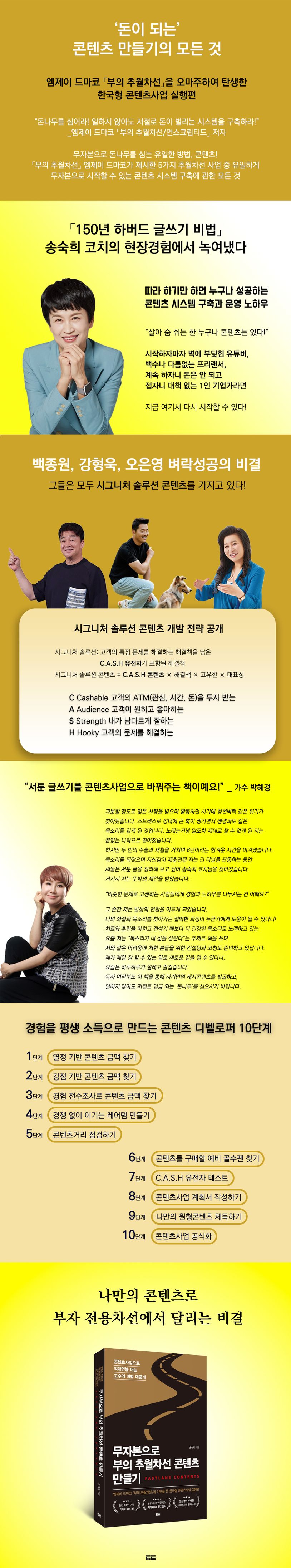 저자는 “당신이 일과 일상에서 경험한 것만 잘 가공해도 크게 힘들이지 않고 콘텐츠로 먹고 살 수 있다”고 단언하며 그 과정을 차례대로 펼쳐 보인다. 이 책은 저자가 현장에서 적용하고 있는 일련의 교육과정으로, 개별화가 가능하도록 구성되어 있어 누구나 나만의 캐시콘텐츠를 채굴해 돈이 마르지 않는 파이프라인 만들 수 있도록 돕는다. 지금 조건에서 바로 시작해 100세까지 계속할 수 있는, 상속까지 가능한 콘텐츠사업의 모든 것을 낱낱이 가이드하고 있다.