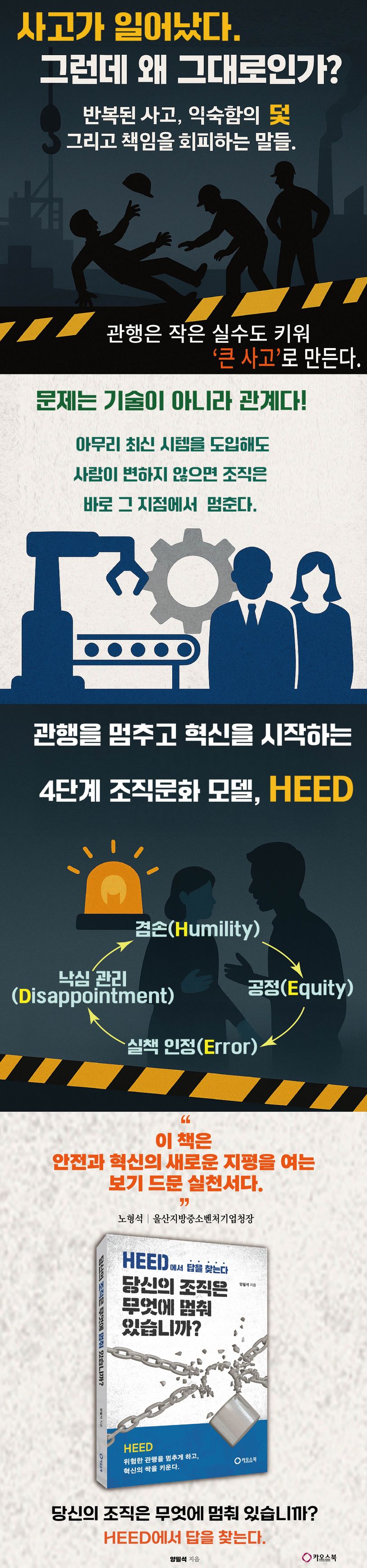 HEED는 안전과 혁신의 새로운 기준을 제시하는 실천형 조직 관행 모델이다. 책은 우리 사회에서 안전사고가 근절되지 않는 근본 원인이 개인과 기업의 ‘겸손 부족’에서 시작된다고 지적하며, 겸손의 결핍이 불공정을 만들고, 불공정이 다시 안전사고와 조직관행을 고착화시키는 악순환을 낳는다고 강조하며, 조직혁신과 안전한 일터를 위해 HEED라는 개념을 제안한다.