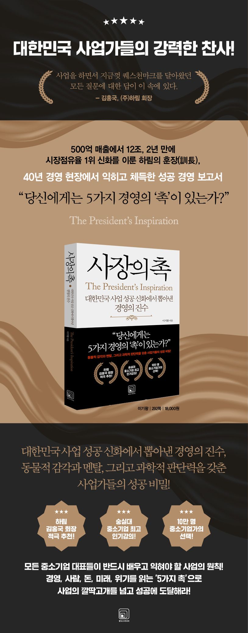 이 책의 저자는 하림의 마케팅을 총괄하는 임원으로서 16년간 하림의 성장과 성공을 직접 경험한 주인공이다. 이 책은 그가 늘 옆구리에 끼고 다니며 메모했던 16년간의 경영 보고서와 숭실대 중소기업대학원 최고 인기강의였던 자신의 강의 내용 중 핵심만을 추려 엮은 것이다. 저자는 “이 책은 대한민국 중소기업 사장들의 교과서다. 5가지 촉을 가지지 못한 사장은 절대 성공할 수 없다!”라고 단호하게 이야기한다. 10만 명 이상의 중소기업 컨설팅을 성공적으로 이끌면서, 그는 사장에게 아무리 동물적 감각과 강한 멘탈이 있어도 ‘경영, 사람, 돈, 미래, 위기를 읽는 사장의 촉’이 없다면 어느 순간 한계에 도달하고 만다는 사실을 깨달았다. 10만 명 이상의 중소기업 사장들이 선택하고, 하림 김홍국 회장이 적극 추천한 이 책은 사장의 길을 걷는 모든 이들이 문제가 풀리지 않을 때, 한계에 도달했을 때, 앞이 막막할 때… 그리고 100억까지는 잘 왔는데 1000억으로 갈 방법을 모르겠을 때 명쾌한 답이 되어줄 것이다.