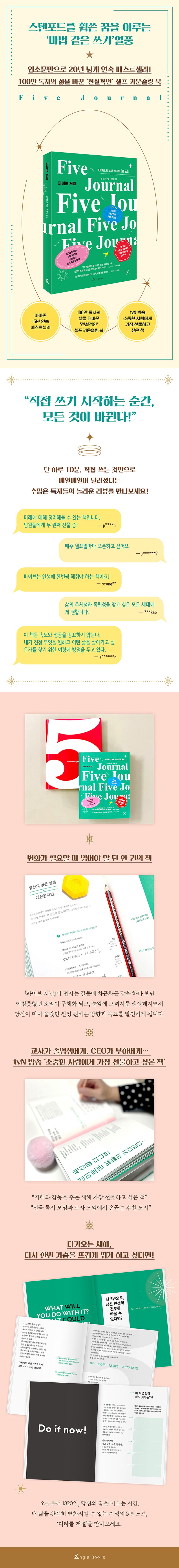 『파이브 저널』은 이러한 질문들을 시작으로, 우리에게 삶이란 무엇이며, 각자의 삶의 가치가 어디에 있는지를 적극적으로 발견하는 마법 같은 실마리들을 제공한다. 다시 말해 독자가 직접 읽고 쓰고 실천하며 이 책을 매개로 현실에서 ‘자신만의 이야기’를 실제로 완성시켜 나갈 수 있도록 이끌어주는 것이다. 그래서일까?