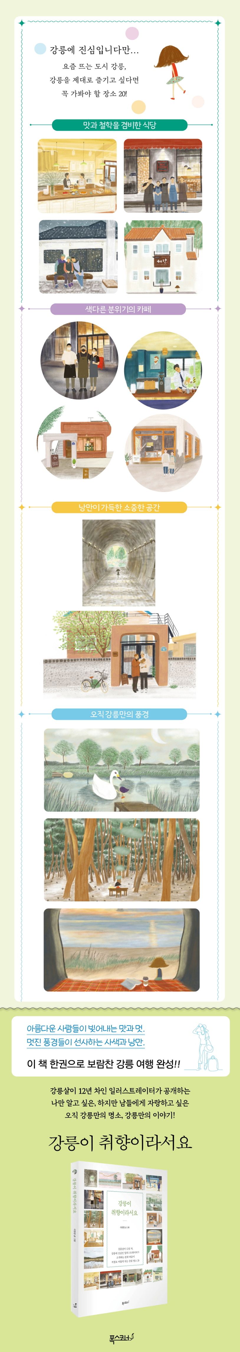 멋진 풍경과 색다른 이력을 가진 이색적인 공간이 자아내는 낭만과 사색 또한 아름답다. 아니, 강릉에 이런 데가 있었어, 싶은 곳을 만나게 된다. 너무나 익숙하고 뻔한 강릉 여행에 지쳤다면, 이 책 한 권으로 색다르고 보람찬 강릉 여행을 완성할 수 있을 것이다. 이현정 작가의 사랑스럽고 따스한 그림과 담백한 글이 자아내는 멋도 이 책의 빠질 수 없는 매력 중 하나이다. 책 속에 등장하는 장소들의 주소와 연락처 등 정보도 담아 두어서 강릉을 여행할 때 들고 갈 딱 한 권의 책으로 손색이 없을 것이다.
