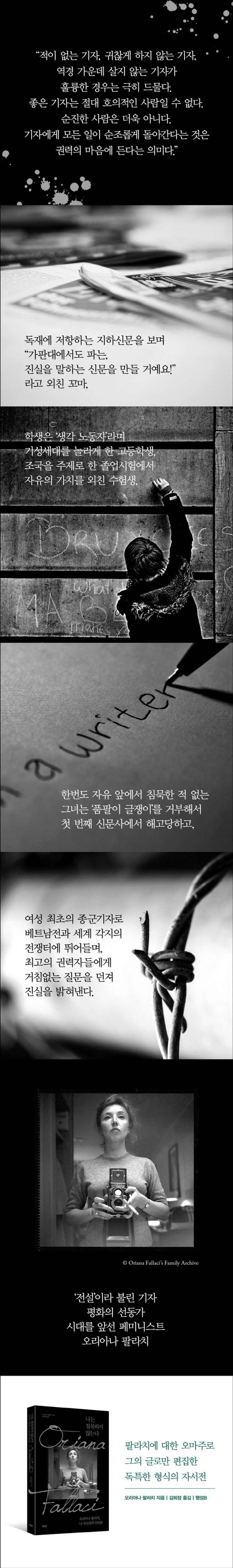 20세기 대표적인 저널리스트 오리아나 팔라치. 이 책은 자서전을 남기지 않은 팔라치를 위해 그의 말과 글로만 구성한 독특한 ‘자서전’이다. ‘전설의 여기자’라는 강인한 이미지가 아니라 내면의 감정을 솔직하게 드러낸 ‘인간 팔라치’를 보여준다. 레지스탕스에 참여하며 자유에 눈뜬 어린 시절, 작가가 되고 싶었지만 생계를 위해 선택한 기자생활, 세계 곳곳의 분쟁 지역에서 겪은 체험담, 최고 권력자들과의 인터뷰 후일담, 연인 알레코스와의 추억, 암 투병을 통해 성찰한 죽음의 의미가 생생하다.