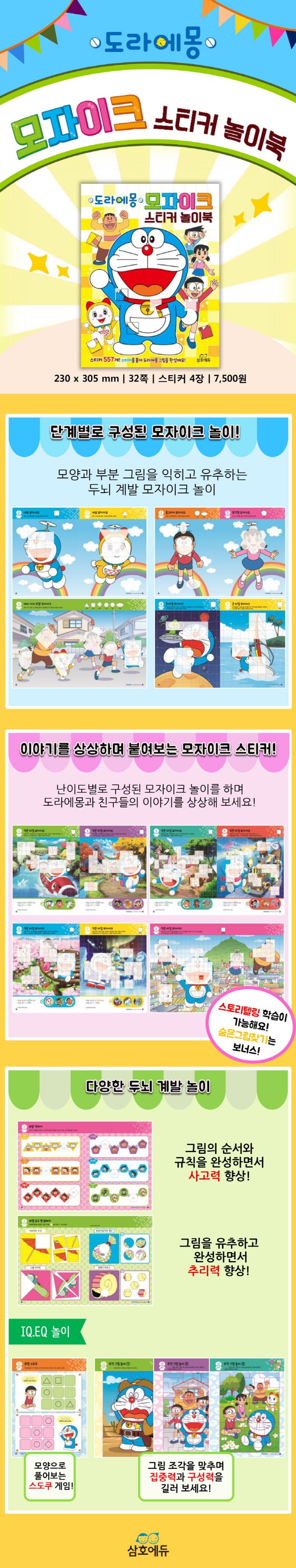 [도라에몽 모자이크 스티커 놀이북]은 명랑 코믹 어드벤처 [도라에몽]의 애니메메이션 속 신나는 장면들을 모자이크 스티커로 만나볼 수 있도록 구성한 놀이북이다. 단계별로 구성된 이 책으로 재미있게 수와 모양을 익히고, 색 감각도 향상시켜 보자. 도라에몽 이야기를 상상하며 스티커를 붙이는 타일 모자이크는 입체적인 두뇌 활동과 함께 이야기를 상상하며 숨은 그림도 찾는 창의력 계발 놀이다. 개구쟁이 친구 도라에몽과 함께 모자이크 스티커를 붙이며 추리력, 상상력, 집중력을 쑥쑥 키워 보자.