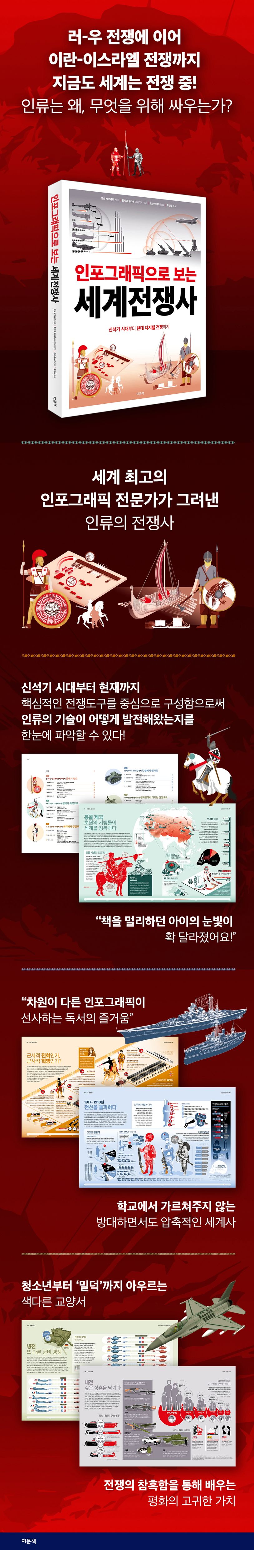 인포그래픽이 더욱 깊이 있는 의미를 더해준 덕분에 저자들의 답변은 전쟁 현상을 역사적으로 가장 넓고 매력적이며 이해하기 쉽게 보여주는 그림을 완성했다. 독자들은 이 책에서 알렉산더 대왕의 정복 활동과 세계대전의 대규모 전투를 입체적으로 조망할 수 있을 뿐 아니라 살라미스 해전 당시 아테네 함대의 조직, 몽골 장군 수부타이의 경력, 중세의 창병 구성, 아스텍 재규어 전사의 장비, 아시아 ‘최초의 세계대전’인 임진왜란, 게다가 로마 군단부터 중세 기사도, 나폴레옹의 제국 서사, 1ㆍ2차 세계대전과 한국전쟁, 최근의 러시아-우크라이나 전쟁에 이르기까지 중요한 전쟁사 요소를 모두 빠짐없이 한눈에 파악할 수 있다. 한마디로 이 『인포그래픽으로 보는 세계전쟁사』는 현대에도 끊임없이 참혹성을 드러내는 전쟁의 양상과 흐름을 이해하는 데 필수적인 책이다.