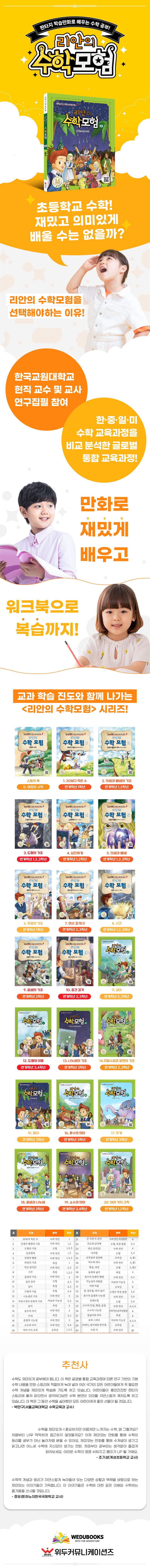 대다수의 아이들이 수학에 대해 생각을 말하면 외우는 과목, 계산하는 과목이라고 합니다. ‘리안의 수학 모험’은 수학의 개념과 원리를 흥미로운 스토리텔링 속에서 자연스레 이해할 수 있게 만들었습니다. 판타지 세계 속에서 수학적 원리를 활용해 문제를 해결하며 모험을 즐기는 사이에, 자연스레 수학에 대한 긍정적 태도와 자신감을 얻을 수 있습니다. 현직교사가 만들고 추천한 초등수학 완전학습서, “리안의 수학 모험”. 한글, 영어 버전이 출간 중입니다.