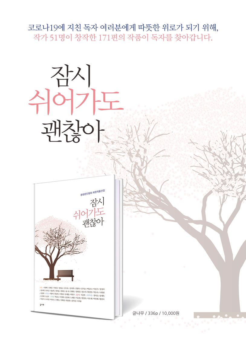 책머리에 회장 정송희 03 【시】이명혜 009 필봉산·25외4편김재준 017 봄의소리외3편이영선 023 헛되고헛되니헛되도다외4편정정순 029 봄날의잔치외4편김수호 035 용마산의봄외4편김지희 045 세화리38외2편김명옥 049 휴지,너도데레사꽃외4편김기순 057 늙은호박외2편백승호 061 다도해외4편이경구 067 겨울을배웅하다외3편장상아 075 찬비외4편김미애 083 미움외3편유후남 089 할매들의반란외4편정송희 095 봄마중외4편정여울 101 봄풍경외2편권재호 105 중심을찾아외4편윤숙 111 불꽃피우기외2편강태호 115 운현궁돌담길외1편정병성 119 꽃소금팝니다외4편전소이 125 마중물외4편함경달 131 대한민국!태양이떠오른다외1편박은숙 137 가을,날아오르다외2편나현명 141 작은여우외1편김종화 145 용마폭포공원외4편【시조】이향자 151 직박구리한쌍외2편한상목 155 눈밭외2편이형남 159 아픔을쓸어내리다외4편유재홍 165 봄은또오는데외2편박헌수 169 철새떼발질외1편【동시】서금복 173 아이스크림을먹을때마다외4편【디카시】정미순 181 균형외4편송재옥 187 철새외4편손귀례 193 모집요강외4편조금주 199 난너만보여외4편【수필】박남순 205 덕분인것도있더라외1편이정화 213 토우새외1편김준태 221 퍼플피플천사의섬외1편노재봉 231 상선약수의삶을꿈꾸며외1편이순헌 237 다어디로갔을까외1편한영옥 245 일상탈출외1편이호재 253 머거리외1편박영재 259 버킷리스트외1편황단아 267 만보걷기이동석 275 효자콤플렉스외1편오서진 281 나무의저녁외1편박효숙 289 몰아주기외1편조혜숙 295 불곰을밀어낸양외1편이해경 303 딸깍발이정신최종찬 309 만남외1편김미경 319 도깨비방망이외1편서석용 327 문자통신외1편