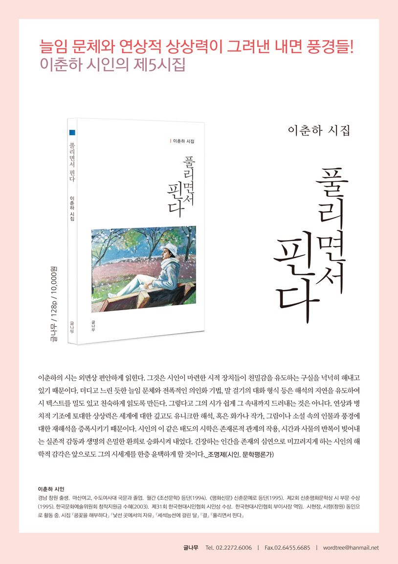 저자:이춘하 경남창원출생 마산여고,수도여사대국문과졸업 월간《조선문학》등단(1994) 《평화신문》신춘문예로등단(1995) 제2회신춘평화문학상시부문수상(1995) 한국문화예술위원회창작지원금수혜(2003) 제31회한국현대시인협회시인상수상 한국현대시인협회부이사장역임 시현장,시향(창원)동인으로활동중 시집『콩꽃을해부하다』『낯선곳에서의자유』『세석능선에걸린달』『결』『풀리면서핀다』
