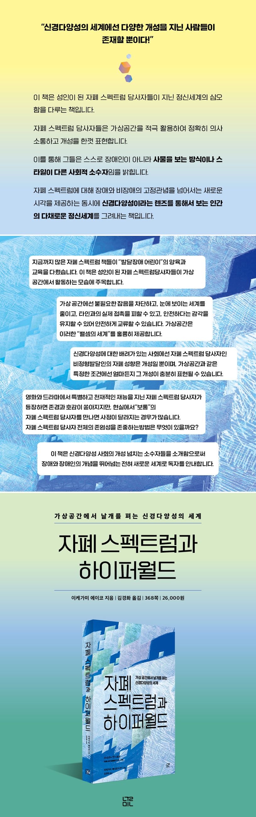 이 책에서 생생하게 그려진 성인 자폐 스펙트럼 당사자들의 모습은 ‘자폐증’에 대한 일반적인 인식을 보기좋게 뒤집어엎는다. 가상공간 속에서 그들은 스스로의 독특한 감각과 지각 체험, 슬픔이나 기쁨 등 다양한 감정, 소수자로서의 어려움 등을 정확한 언어로 표현하면서 서로 공감한다. 저자의 이 연구는, 2019년 일본 공영방송(NHK)에서 2부작 다큐멘터리 〈자폐증 아바타의 세계〉로 제작, 방영되었다. 물리적 공간에서는 어려움이 있지만 가상 공간에서는 활발하게 소통하고 교류하는 자폐 스펙트럼 당사자들의 모습이 전파를 타면서 일본에서도 큰 화제를 불러일으켰다.