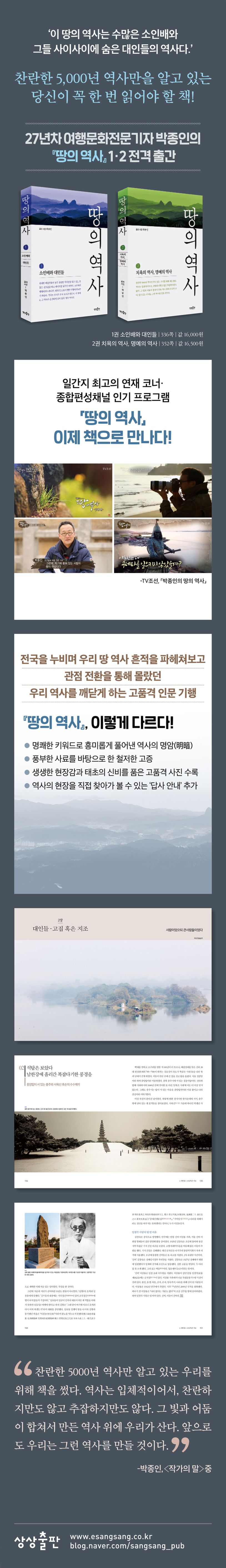 단행본으로 만나는 『땅의 역사』는 역사 현장을 답사하고 신문에 연재한 글들 중 고대사부터 현대의 풍경까지 우리 역사에 중증 내·외상을 남긴 사건과 사람들의 이야기를 그러모은 것으로, 일주일에 한 번, 신문 1면의 분량으로는 다할 수 없던 다양한 이야기를 재구성해 소개한다. 특히 전2권을 관통하는 키워드를 ‘소인배’와 ‘대인’으로 보고 우리 땅 구석구석에서 발견한 역사의 명암을 거침없는 주제로 재편해 보여준다.