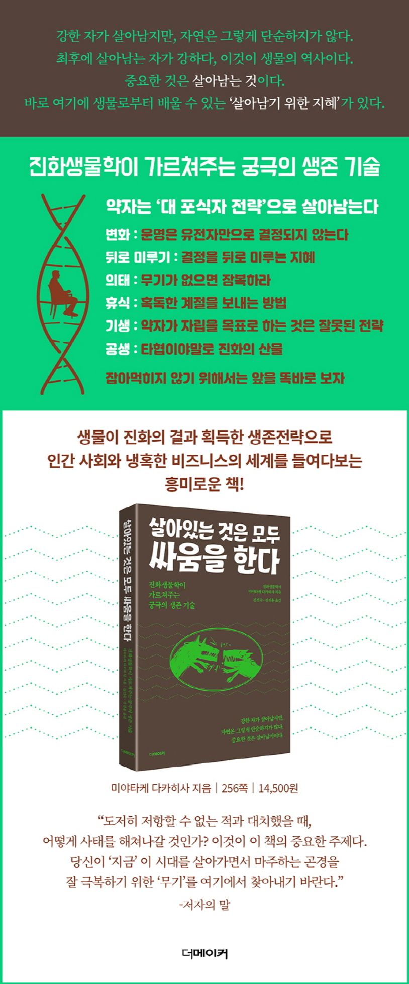 생물들의 생존 기술을 따라가는 것은 그것 자체로 매우 흥미진진한 일이다. 뿐만 아니라 우리는 거기에서 살아가는 데 필요한 많은 지혜를 얻을 수 있다. 우리는 지금 이 시대를 살아가면서 마주하는 다양한 곤경을 잘 극복하기 위한 ‘무기’를 여기에서 찾아낼 수 있을 것이다.