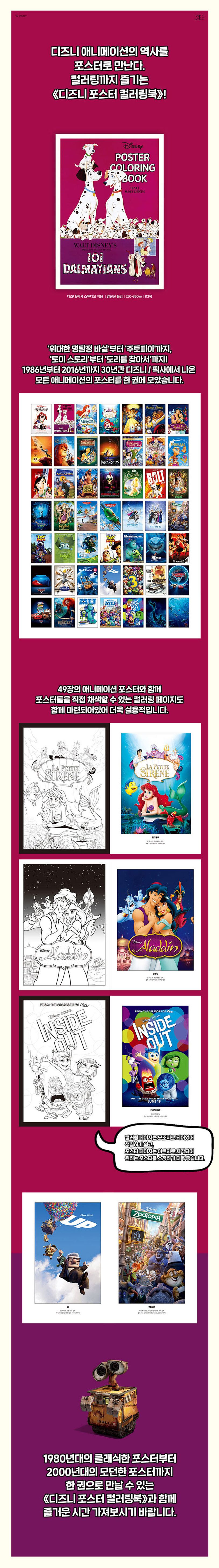 《디즈니 포스터 컬러링북》은 1986년 상영된 디즈니의 고전 애니메이션 〈위대한 명탐정 바실〉부터 〈주토피아〉,〈도리를 찾아서〉까지, 30년간 디즈니/픽사에서 제작된 애니메이션 49편의 포스터를 한 권으로 모은 포스터&컬러링북입니다.