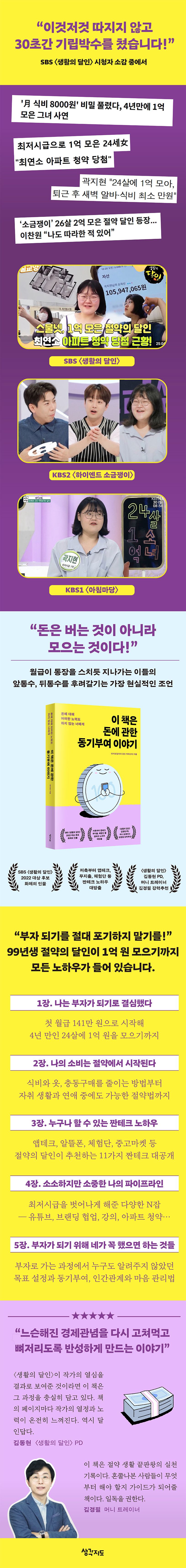 화제의 주인공인 곽지현 작가가 이번에는 책 출간에 도전했는데 바로 《이 책은 돈에 관한 동기부여 이야기》이다. 이 책은 단순히 1억 원을 모은 이야기를 들려주기 위해 쓴 게 아니다. 비빌 언덕이라곤 없던 작가가 자신의 삶을 책임지기 위해 1억 원을 모으기까지의 과정을 가감 없이 보여주면서 ‘절약’과 ‘저축’만으로 누구나 할 수 있다는 것을 알려주기 위해서다. 무엇보다 돈에 대해 아무런 노력도 하지 않으면서 부자가 되고 싶다는 이들에게 자극과 동기부여를 주면서 돈에 끌려다니고 돈 때문에 제약받지 않는 주체적인 삶을 살자고 권하는 책이다.