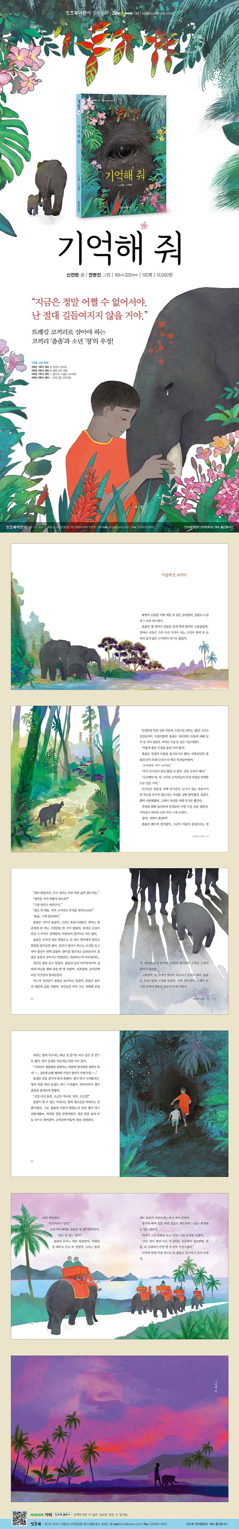 〈기억해 줘〉는 코끼리 ‘촘촘’이 인간들에게 잡혀서 트레킹 코끼리로 길들여지고 그 과정에서 ‘창’이라는 소년을 만나 우정을 나누는 이야기입니다. 〈기억해 줘〉는 어린이들의 정서에 맞도록 잔인함을 느낄 수도 있는 표현이나 그림은 넣지 않고 스토리의 전개 속에 분명한 메시지를 담아냈습니다. 이야기에 몰입한 우리 어린이들이 주인공 촘촘과 자신을 동일시하여 마음에 큰 울림을 느낄 것입니다. 많은 어린이들이 이 책을 읽고 동물권을 알고 생명을 존중하는 마음을 갖기 바랍니다.