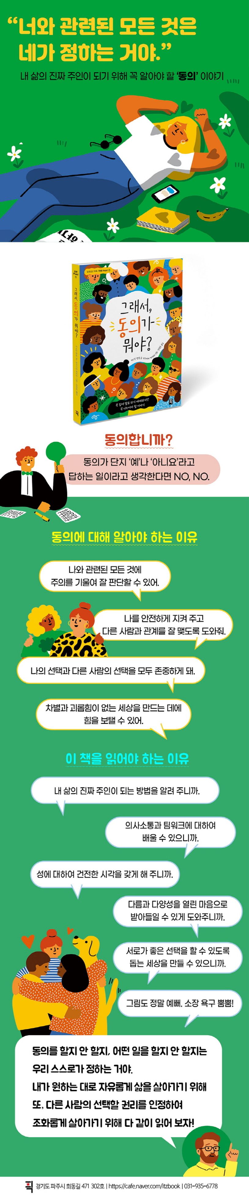 《그래서, 동의가 뭐야?》는 ‘동의’라는 개념을 통해 자기 자신과 상대를 존중하는 법을 배우고, 공정하고 평등한 세상을 함께 만들기 위해 필요한 일들을 고민해 보는 책입니다. 이 책을 읽으면 ‘동의’가 무엇인지, 왜 우리가 ‘동의’에 대해 알아야 하는지, 또 일상생활에서 ‘동의’를 실천하는 방법에는 무엇이 있는지를 알게 됩니다. 이 책은 무엇보다도 우리에게 선택할 힘과 권리, 그리고 자유가 있다는 사실을 깨닫게 합니다. ‘선택할 수 있다.’는 말은 우리에게 용기를 줍니다. 또, ‘원하지 않으면 선택하지 않아도 된다.’는 것을 알면 오히려 할 수 있는 일이 늘어납니다. 자기 안의 힘을 아는 사람은 더욱 즐겁게 적극적으로 삶을 살아가고, 어려움에 부딪혀도 잘 극복할 것입니다. 이 책과 함께 정말 내가 원하는 것이 무엇인지, 그것을 이루려면 어떻게 해야 하는지 생각하는 시간을 가져 보기를 바랍니다.