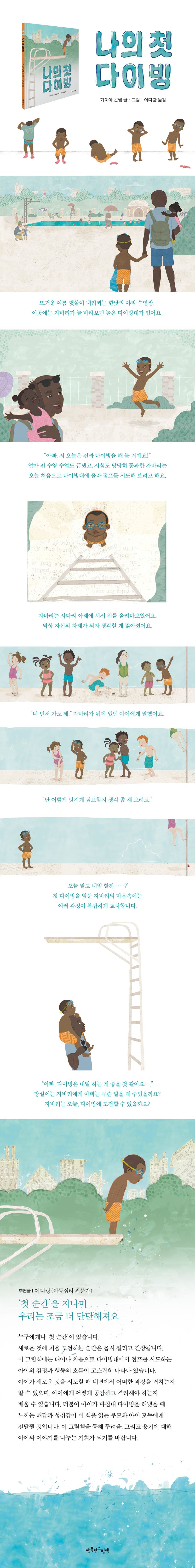 설레는 목소리로 외치는 자바리의 눈빛이 기대감으로 반짝입니다. 기다란 사다리를 타고 다이빙대 위로 올라, 하늘 높이 폴짝 뛰어 아래로 풍덩! 물속으로 뛰어드는 아이들을 지켜보던 자바리는 떨리는 마음을 숨기며 차례를 기다립니다. 그런데 막상 자신의 차례가 되자 머릿속이 복잡해집니다. 어떻게 점프하면 멋질까 고민도 되고요.